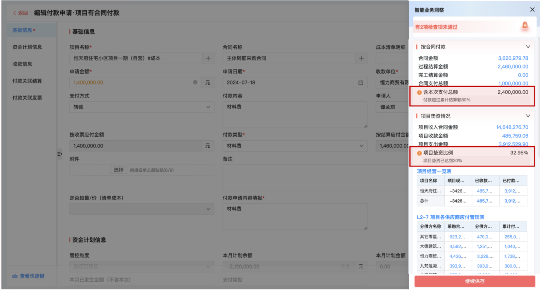 通過(guò)系統(tǒng)實(shí)時(shí)看得到公司資金情況,明確知道哪些項(xiàng)目能有資金去做去投資、哪些資金要計(jì)劃對(duì)外結(jié)算支付,項(xiàng)目現(xiàn)在開(kāi)了多少票、還有多少錢(qián)沒(méi)有回,同時(shí)也能對(duì)進(jìn)度款、質(zhì)保金、投標(biāo)保證金等回款設(shè)置提醒,防止逾期未回。項(xiàng)目墊資情況也能同步關(guān)注,判斷公司的經(jīng)營(yíng)狀況是否穩(wěn)健。