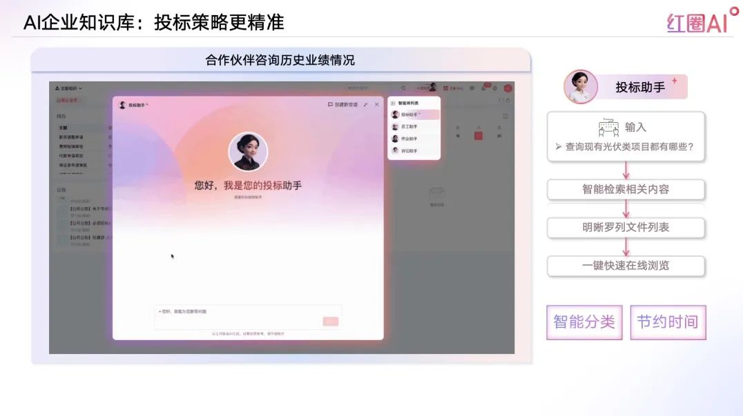 以往投標(biāo)流程中,資料查找和內(nèi)容比對耗時耗力、風(fēng)險頻發(fā)。紅圈AI通過快速檢索歷史標(biāo)書、技術(shù)方案、成功案例等內(nèi)容,助力企業(yè)建立專屬“投標(biāo)智庫”,讓策略制定更具數(shù)據(jù)支撐。