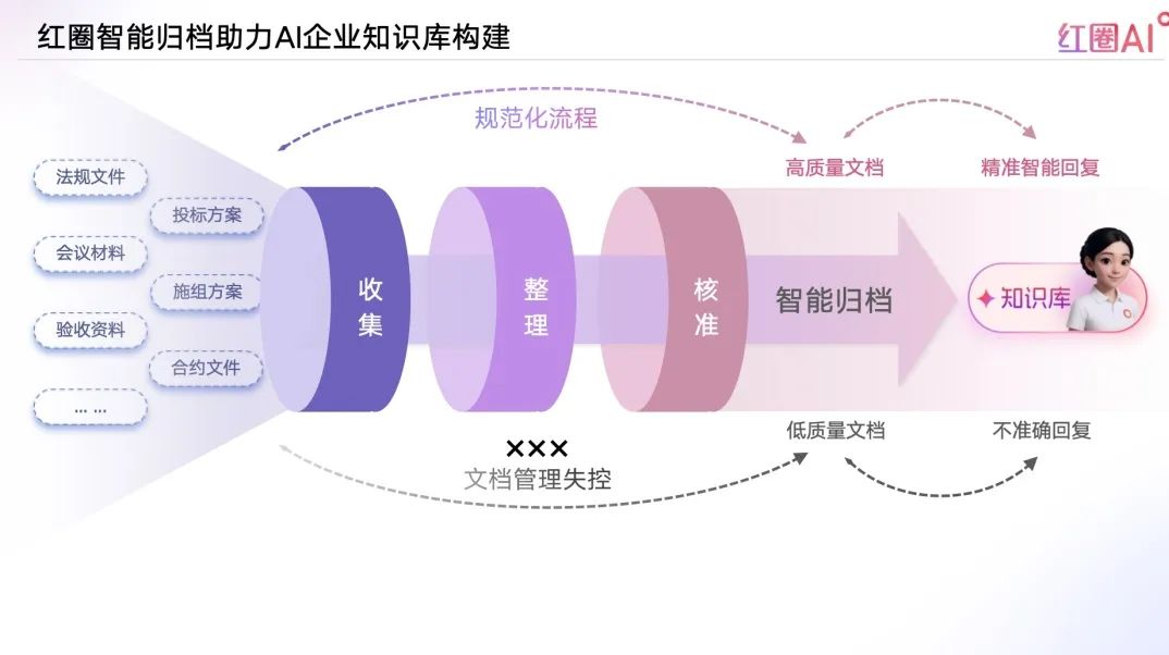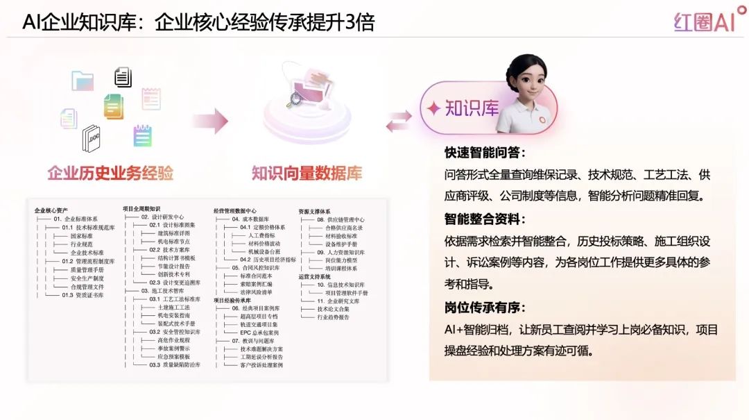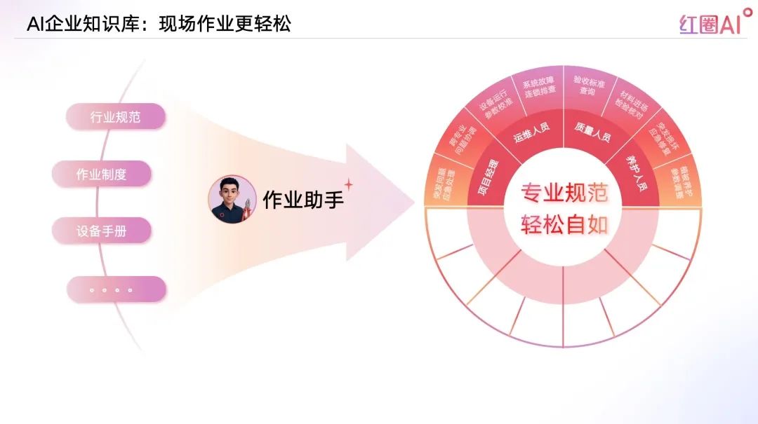 紅圈AI,以大模型+智能檢索技術(shù)為引擎,構(gòu)建企業(yè)知識資產(chǎn)體系,實現(xiàn)“經(jīng)驗即問即答”,推動企業(yè)從“人找知識”走向“知識找人”。