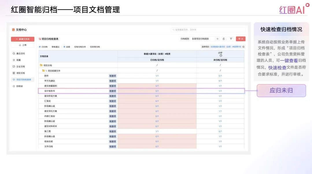 系統(tǒng)自動按照業(yè)務(wù)單據(jù)上傳文件情況,形成“項目歸檔檢查表”,公司負(fù)責(zé)資料管理的人員,可一鍵查看歸檔情況,包括“應(yīng)歸未歸”、“應(yīng)歸已歸”、“已歸未審核通過”等。