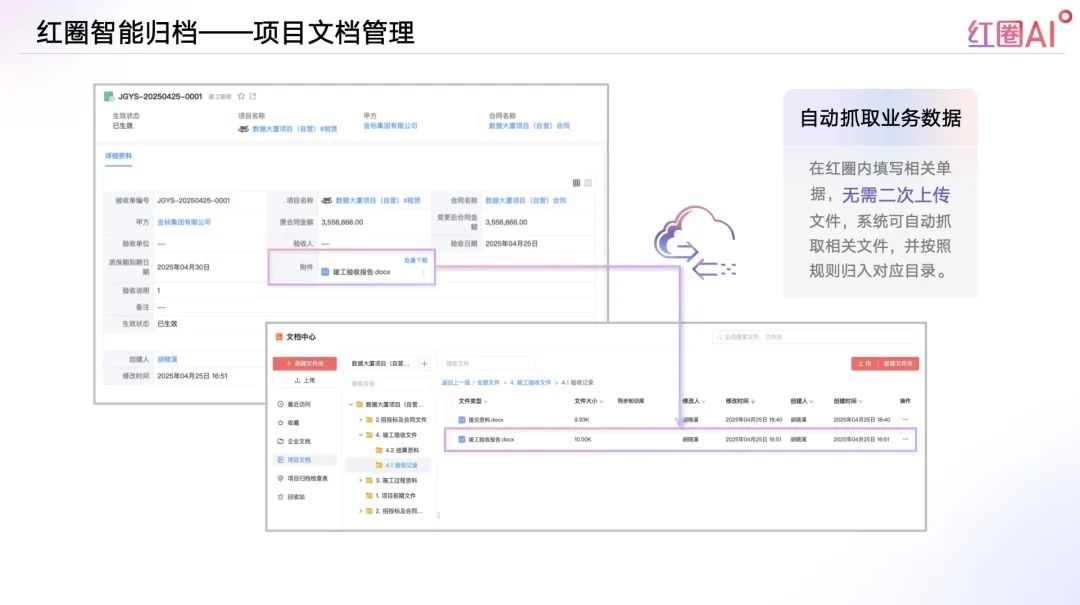 在紅圈內(nèi)填寫相關(guān)單據(jù),無需二次上傳文件,系統(tǒng)可自動抓取相關(guān)文件,并按照規(guī)則歸入對應(yīng)目錄;