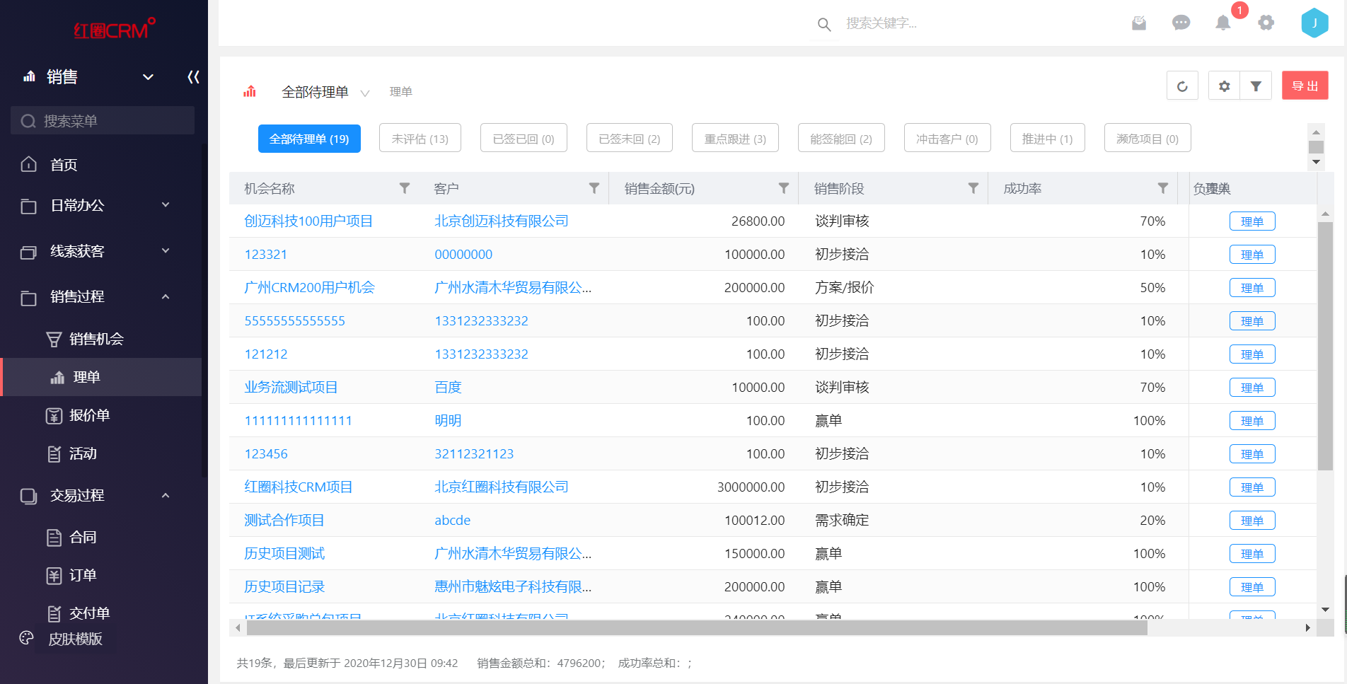 在銷售管理方面,2020 年紅圈 CRM 也有了長(zhǎng)足的改進(jìn),新增了交付單和報(bào)價(jià)單管理,為實(shí)現(xiàn) CPQ 奠定基礎(chǔ)。增加變更單,支持合同變更。新增找線索功能,幫助企業(yè)高效獲取銷售線索。還有優(yōu)化改進(jìn)理單和公海池等等。在銷售管理方面的不斷打磨演進(jìn),使紅圈 CRM 更好的服務(wù)于裝備制造行業(yè)。
