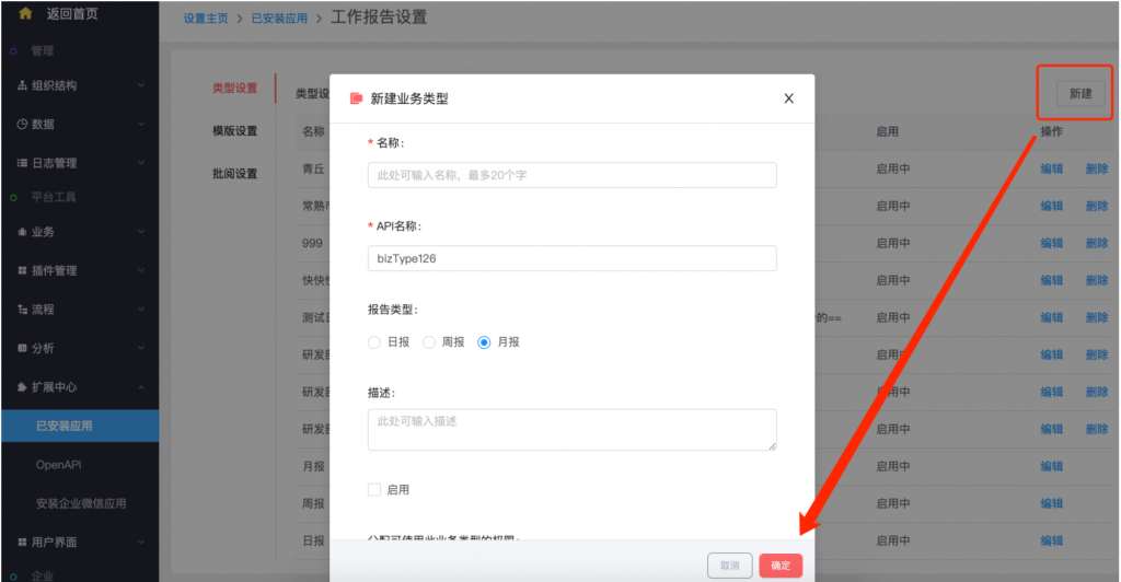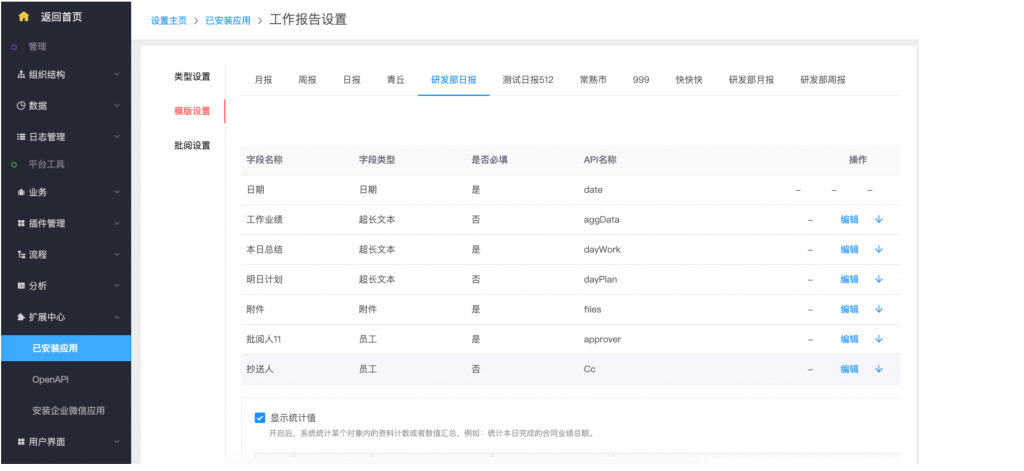 - 后臺(tái)設(shè)置:系統(tǒng)設(shè)置——擴(kuò)展中心——已安裝應(yīng)用——工作報(bào)告,類(lèi)型設(shè)置支持新建類(lèi)型;在模板設(shè)置中,可以按業(yè)務(wù)類(lèi)型設(shè)置不同的字段和統(tǒng)計(jì)值;統(tǒng)計(jì)值設(shè)置,支持自定義名稱(chēng);