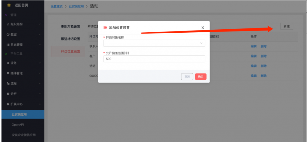 - 系統(tǒng)設(shè)置——擴(kuò)展中心——已安裝應(yīng)用——活動(dòng),增加了“拜訪(fǎng)位置設(shè)置”。新建拜訪(fǎng)位置設(shè)置,選擇拜訪(fǎng)對(duì)象、設(shè)置參考字段并設(shè)置允許偏差范圍