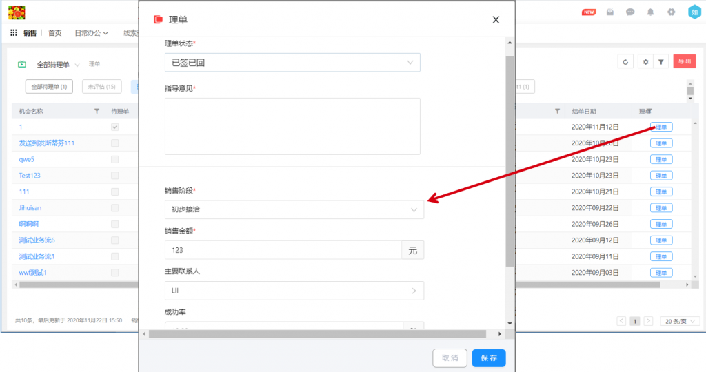 理單列表頁(yè)可直接理單,理單時(shí)可編輯相關(guān)機(jī)會(huì)字段