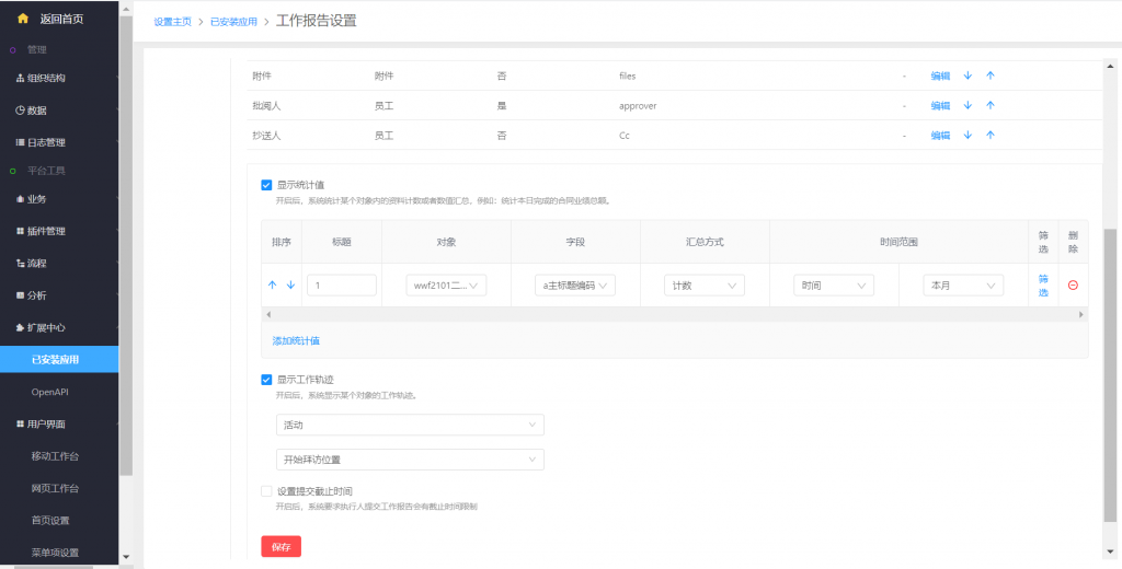【后臺(tái)設(shè)置】系統(tǒng)設(shè)置—擴(kuò)展中心—已安裝應(yīng)用—工作報(bào)告—模板設(shè)置中,在原有統(tǒng)計(jì)值下面增加了顯示工作軌跡,可以配置一個(gè)對(duì)象的一個(gè)地圖定位型字段進(jìn)行統(tǒng)計(jì),統(tǒng)計(jì)時(shí)間默認(rèn)為報(bào)告時(shí)間段內(nèi),如周報(bào)默認(rèn)統(tǒng)計(jì)一周內(nèi)創(chuàng)建這個(gè)對(duì)象的數(shù)據(jù)