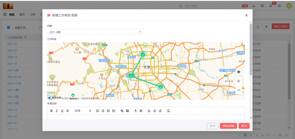 【前臺(tái)操作】新建工作報(bào)告、查看工作報(bào)告,可以根據(jù)后臺(tái)配置的軌跡對(duì)象的定位字段,形成地圖連線,并支持點(diǎn)擊查看詳情