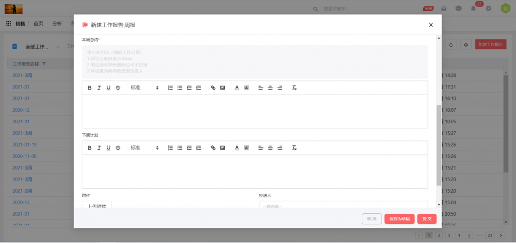 新建工作報(bào)告、查看工作報(bào)告,在總結(jié)字段上方默認(rèn)展示上次報(bào)告計(jì)劃字段的內(nèi)容