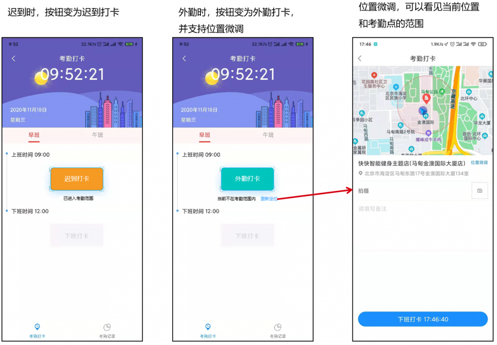 3)APP端考勤打卡頁(yè)面調(diào)整,支持位置微調(diào),遲到早退等異常打卡需填寫(xiě)備注和拍照等