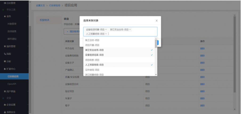 2)添加與項(xiàng)目關(guān)聯(lián)的業(yè)務(wù)對(duì)象,如合同、收付款、開(kāi)票、設(shè)備和工程量清單等;