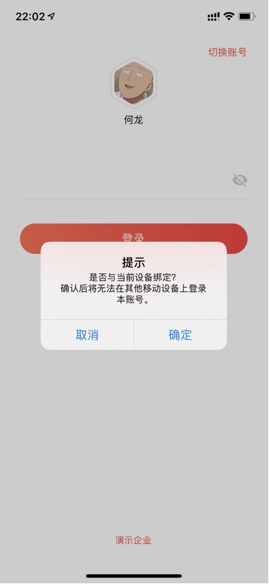 功能開(kāi)啟后,賬號(hào)第一次在移動(dòng)端登錄時(shí),將提示進(jìn)行設(shè)備綁定,同意后可正常進(jìn)入系統(tǒng)使用;取消則無(wú)法登錄,如果需要更換手機(jī),請(qǐng)聯(lián)系管理員進(jìn)行后臺(tái)的解綁操作