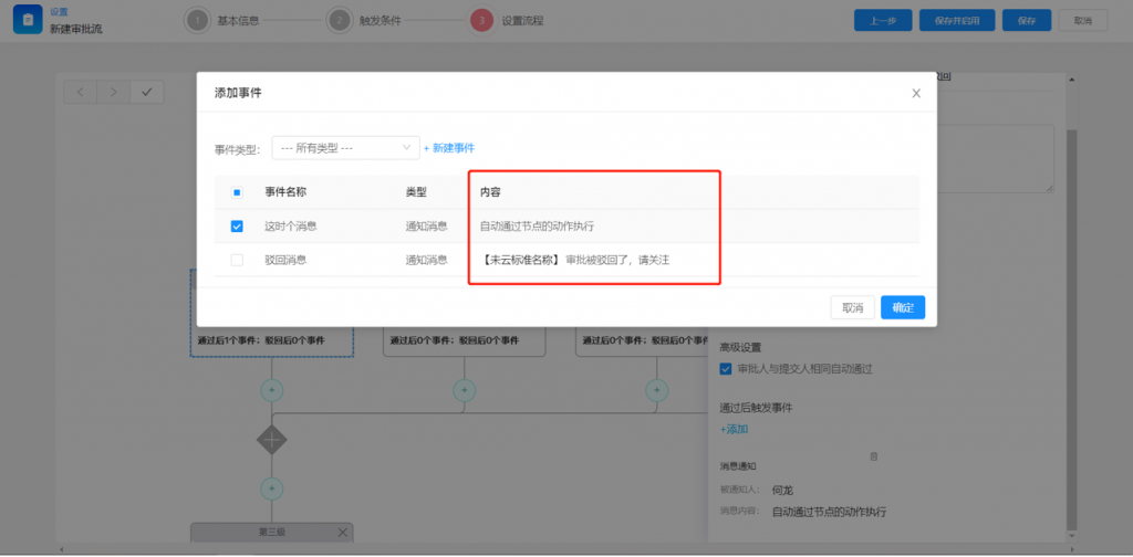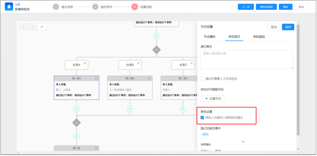2)審批流節(jié)點(diǎn),可配置當(dāng)與提交人相同時(shí),自動(dòng)通過(guò),減少重復(fù)操作