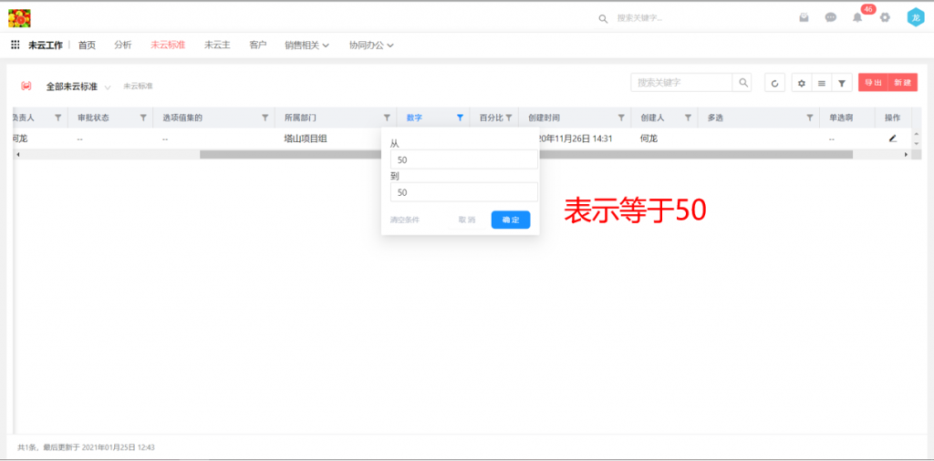7)數(shù)據(jù)列表中,數(shù)值型字段在表頭篩選時(shí)可以只輸入一邊,或者兩邊輸入相同數(shù)值,進(jìn)行篩選