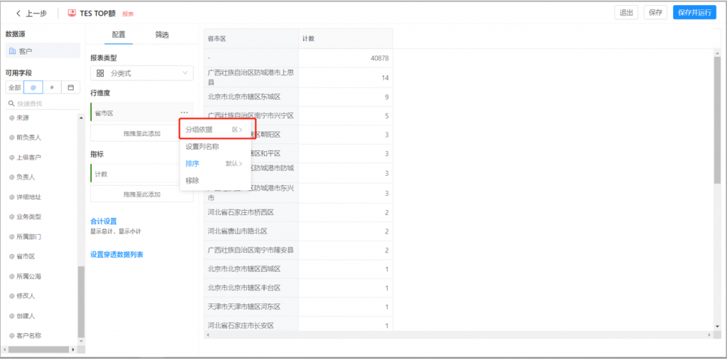 4)省市區(qū)字段增加按區(qū)分組
