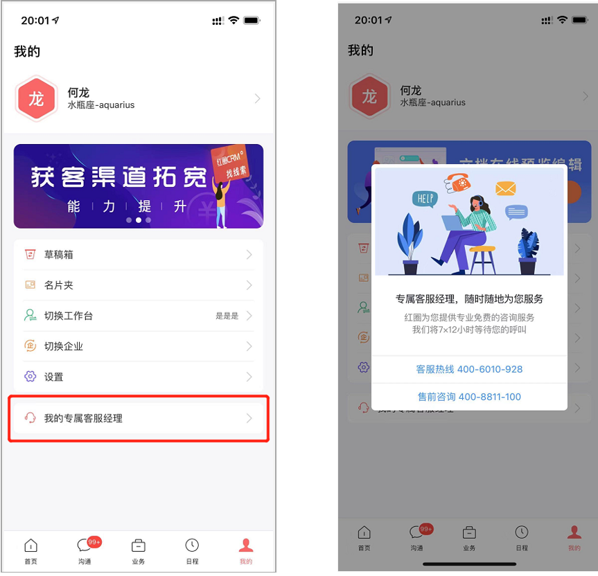 3)移動(dòng)端在“我的”中,增加專屬客服經(jīng)理的電話展示