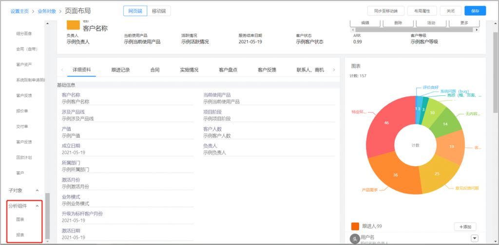在數(shù)據(jù)資料的詳情頁(yè)面上,可以查看相關(guān)對(duì)象的報(bào)表。實(shí)現(xiàn)以當(dāng)前數(shù)據(jù)為中心,360度視圖輕松查看分析全貌