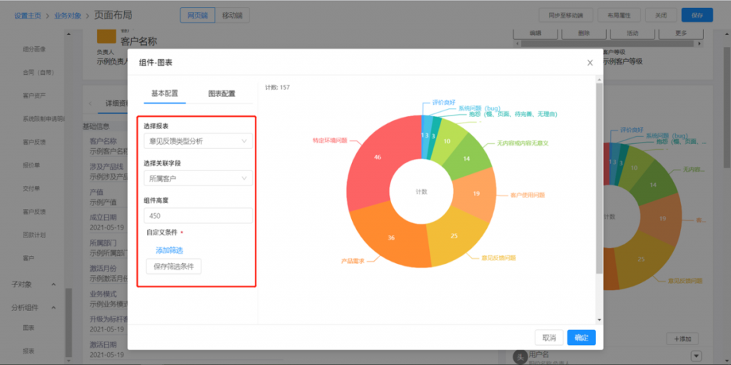 - 基本配置:選擇相關(guān)對(duì)象的報(bào)表,指定關(guān)聯(lián)字段,也可以配置篩選條件