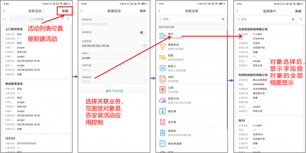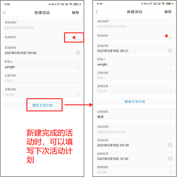 APP端活動(dòng)列表可以在列表頁(yè)直接新建,完成活動(dòng)時(shí)可快速填寫“下次計(jì)劃”