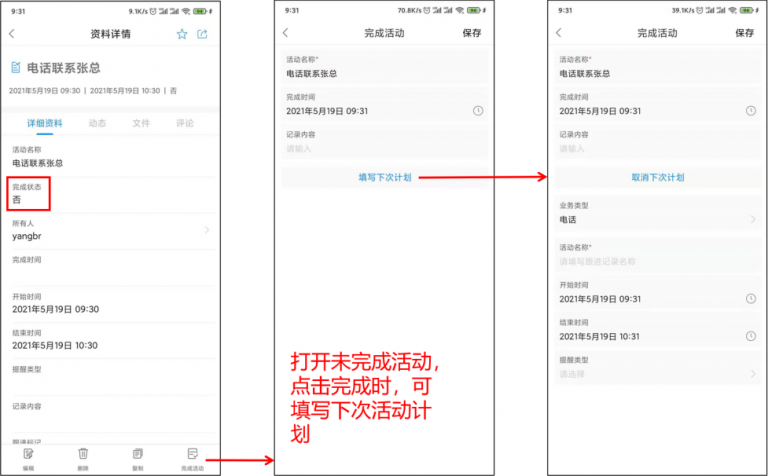 填寫的下次計(jì)劃,類型和當(dāng)前活動(dòng)類型一致,可修改