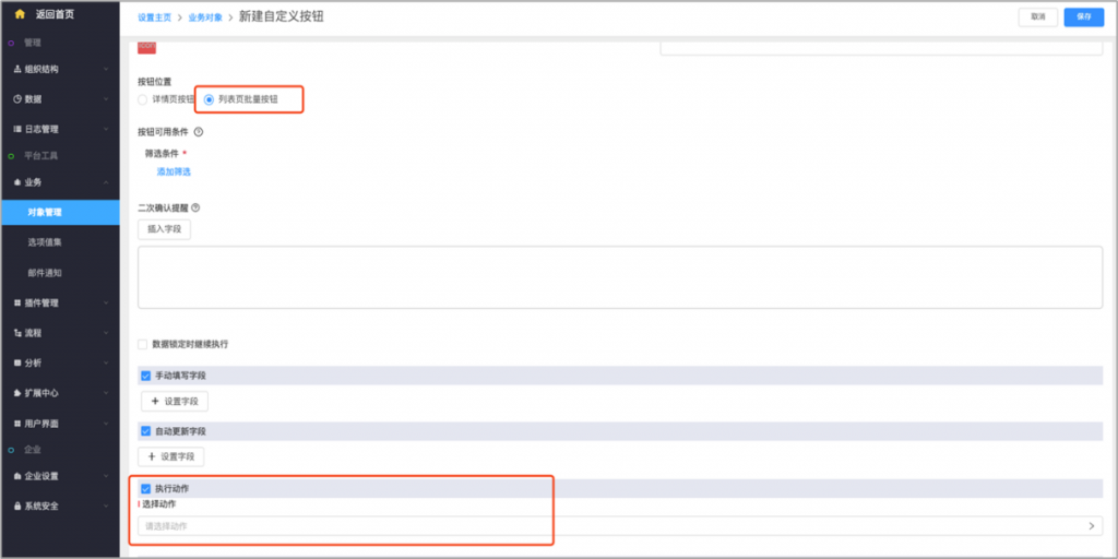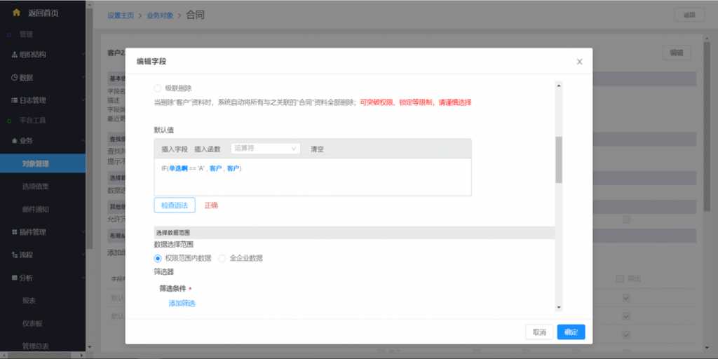 可以選擇下游對(duì)象和相關(guān)操作,其中資料編輯需勾選具體字段,可選范圍是下游對(duì)象字段追蹤里的字段