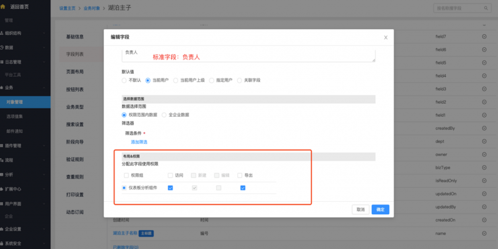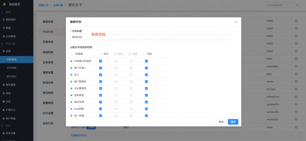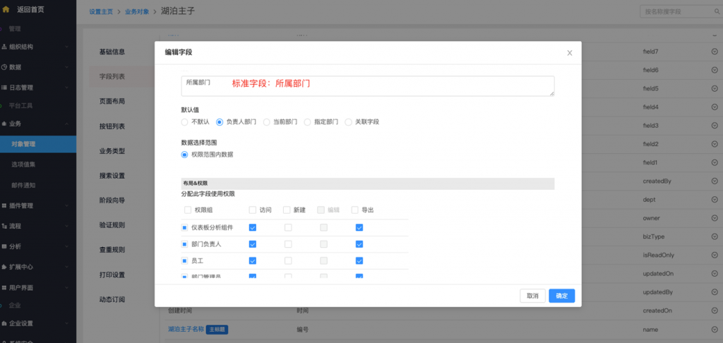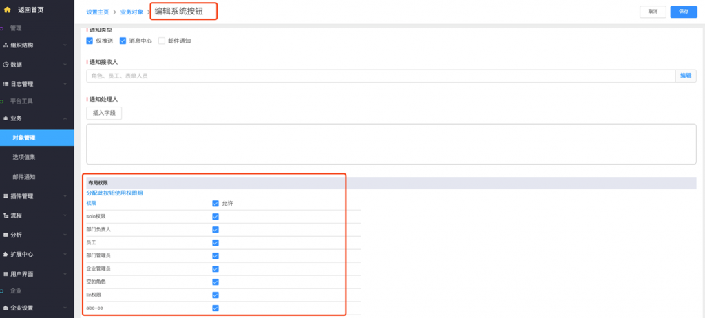 - 系統(tǒng)字段及按鈕修改權(quán)限配置:系統(tǒng)字段、標(biāo)準(zhǔn)字段(所屬部門及負(fù)責(zé)人)、按鈕支持在編輯時(shí)修改權(quán)限