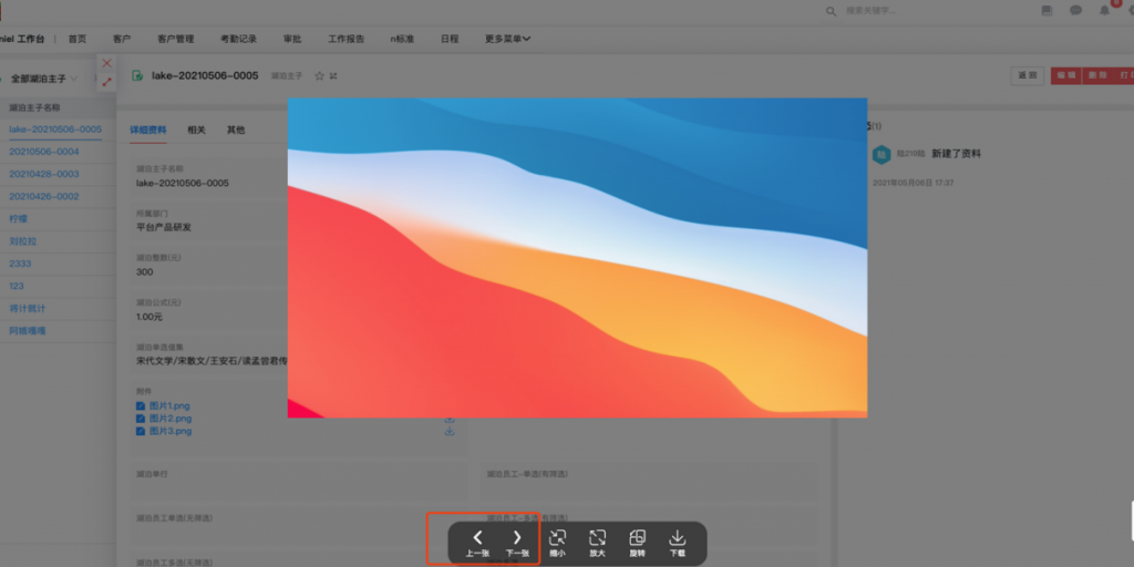 - 附件字段中的圖片預(yù)覽時(shí)可上下切換:附件字段中詳情頁(yè)的圖片在預(yù)覽時(shí)可以上下切換
