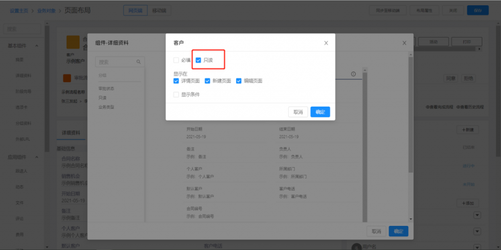 - 頁(yè)面布局字段可配置只讀:頁(yè)面布局-詳細(xì)資料組件中,字段可配置只讀屬性,在新建或編輯時(shí),字段不可手動(dòng)填寫,但默認(rèn)值可正常計(jì)算