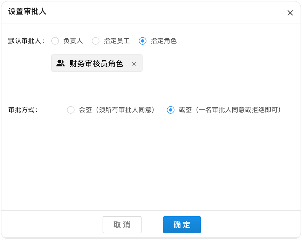 如果小王的公司對報銷把控比較嚴格,要求兩個財務(wù)審核同事全部同意后流程才能通過,那么可以在后臺將他們設(shè)置成“多人會簽”。