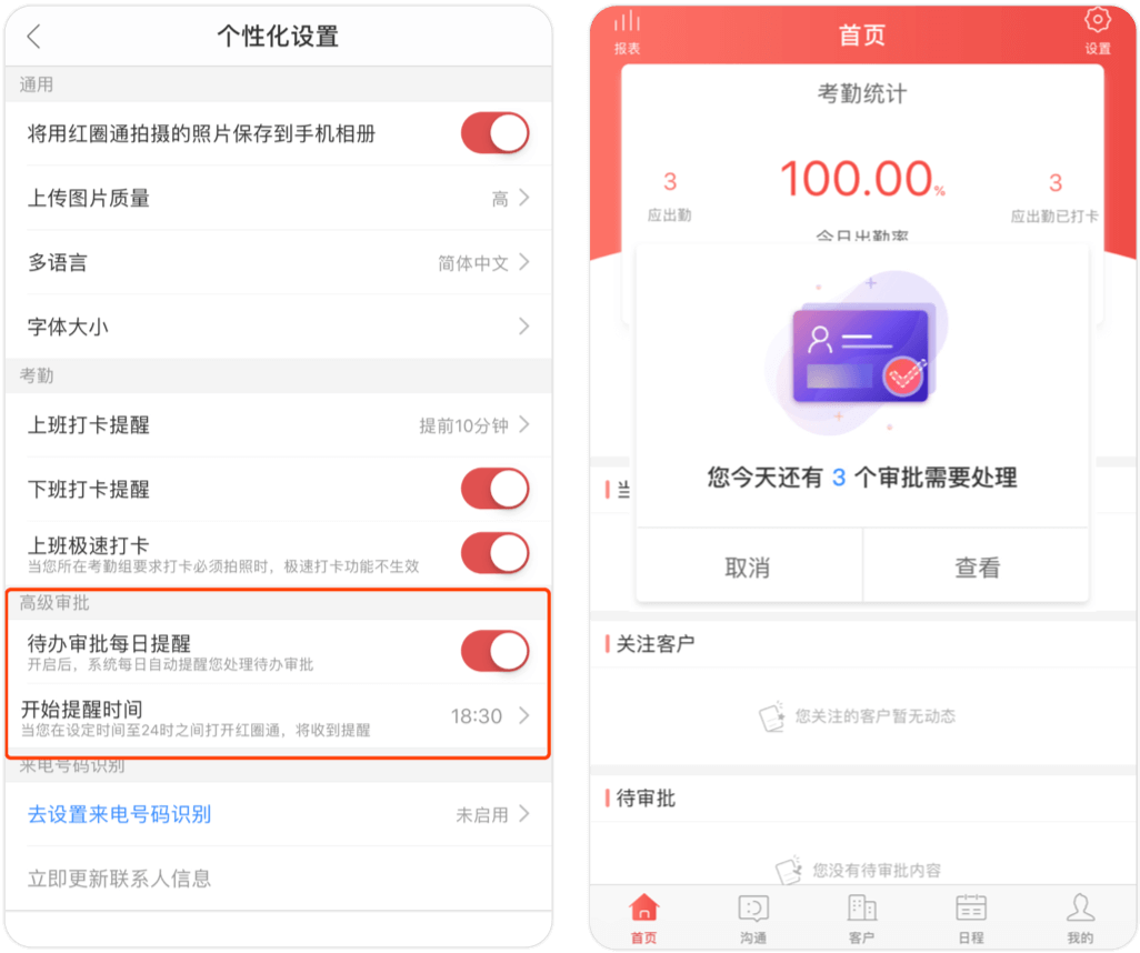 可在個人設(shè)置中開啟定時待辦每日提醒,防止貽誤重要工作。