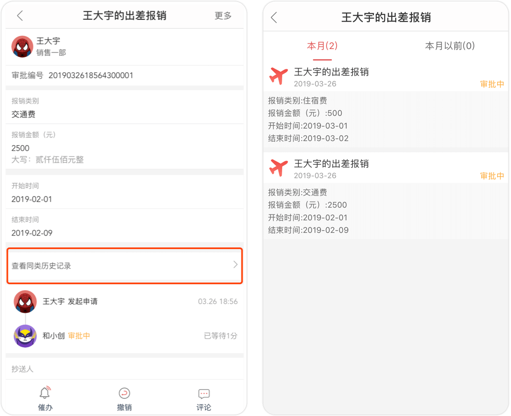 審批人可以查看發(fā)起人同類審批的歷史情況。比如報銷審批時,可以看該員工本月或之前已經(jīng)發(fā)起了幾次報銷申請。