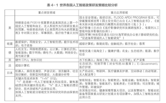 1)國際比較:各國人工智能戰(zhàn)略與政策各有重點。中國人工智能政策聚焦于實現(xiàn)人工智能領域的產(chǎn)業(yè)化,助力中國的制造強國政策。