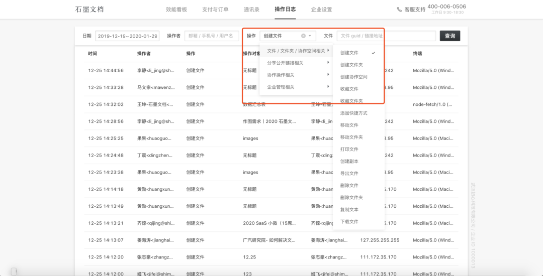 企業(yè)創(chuàng)建者和管理員在后臺可以查詢某一時(shí)間段的所有操作日志。