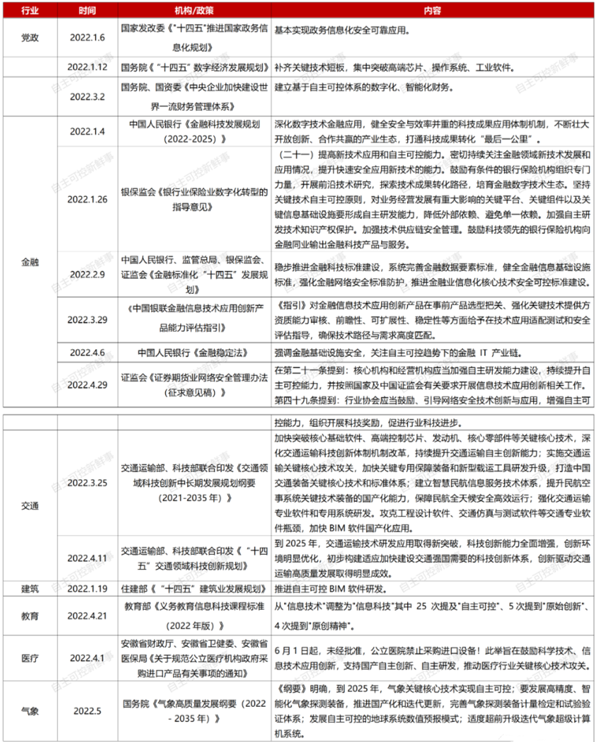 據(jù)不完全統(tǒng)計,截至2022年6月13日,國家頂層設(shè)計層面共出臺信創(chuàng)相關(guān)政策14份。分行業(yè)來看,金融6份、交通2份、建筑1份、教育1份、醫(yī)療1份(安徽?。?、氣象1份。