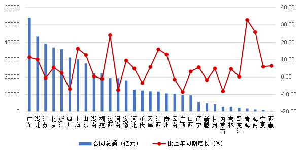 2023年上半年,廣東、湖北、江蘇、北京、浙江、四川、上海等7個(gè)地區(qū)建筑業(yè)企業(yè)合同總額均超過(guò)30000億元,分別達(dá)到54142.75億元、43200.05億元、39176.44億元、37001.58億元、36004.49億元、31243.04億元和30146.28億元。合同總額超過(guò) 20000 億元的還有山東、湖南、福建3個(gè)地區(qū)。合同總額同比增長(zhǎng)最快的是青海,達(dá)到了32.80%。海南、陜西、上海和江西的增幅也都超過(guò)了15%。9個(gè)地區(qū)合同總額出現(xiàn)負(fù)增長(zhǎng),其中廣西、內(nèi)蒙古的負(fù)增長(zhǎng)均超過(guò)8%(圖6)。