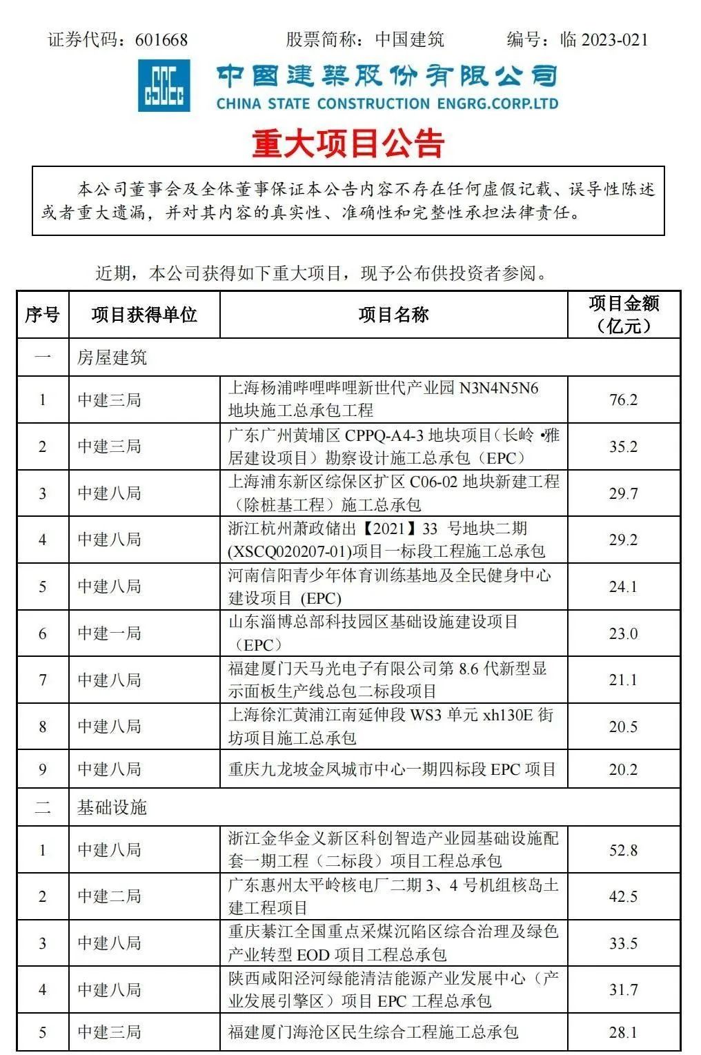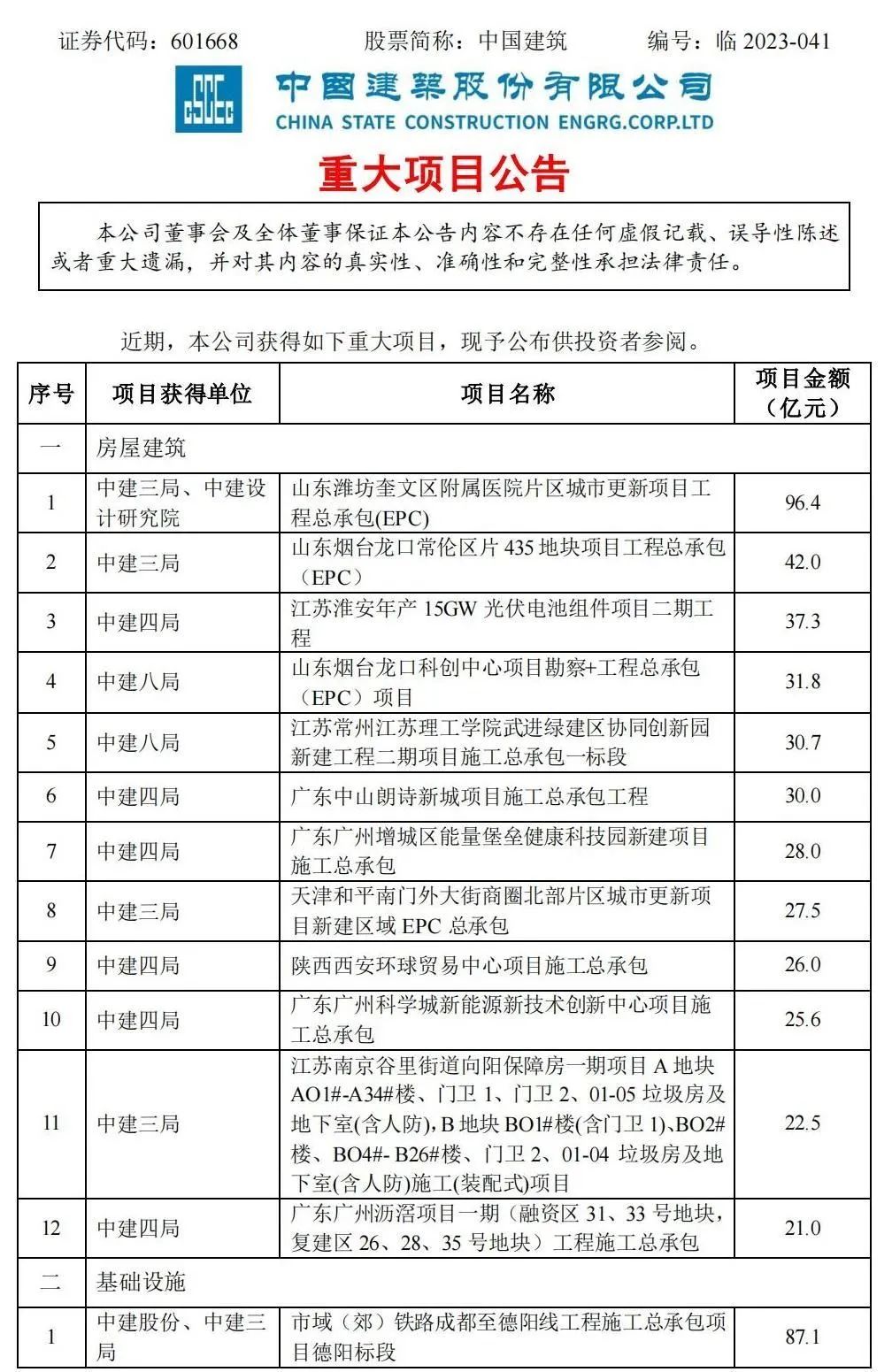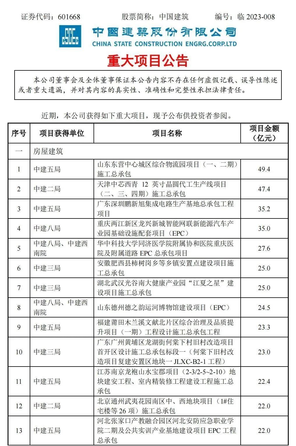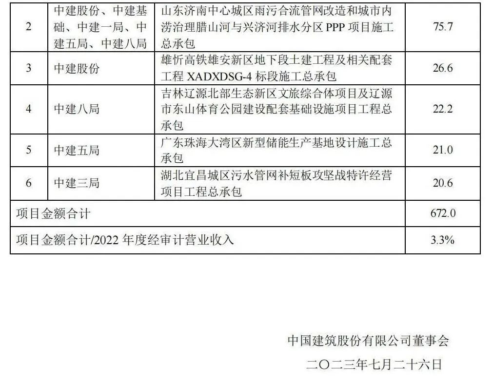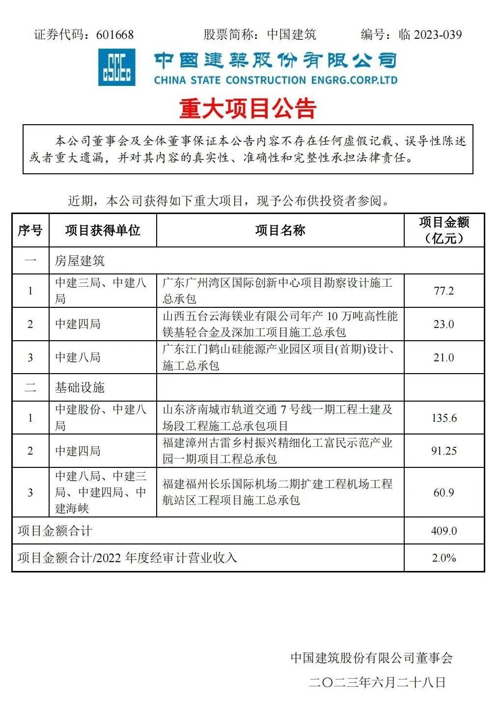 附中國建筑重大項目公告:
