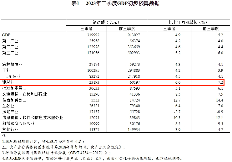 10月18日,國家統(tǒng)計(jì)局發(fā)布2023年三季度國民經(jīng)濟(jì)相關(guān)數(shù)據(jù)。初步核算,前三季度國內(nèi)生產(chǎn)總值913027億元,按不變價格計(jì)算,同比增長5.2%。建筑業(yè)第三季度總產(chǎn)值23193億元,前三季度60197億元。