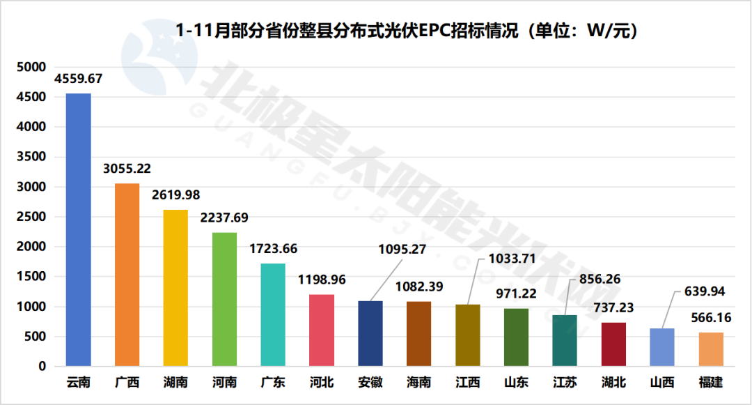 從區(qū)域分布來看,1-11月,國內(nèi)光伏電站EPC招標(biāo)項(xiàng)目主要分布在云南、廣西、湖南、河南、廣東等22個(gè)省份。