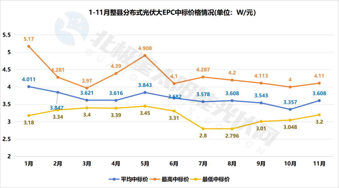 具體來看,1-11月大EPC項(xiàng)目的均價(jià)在逐漸下降,從年初的4.011元/W降至11月份的3.608元/W,其中,最高價(jià)格5.17元/W出現(xiàn)在1月,項(xiàng)目為國家能源集團(tuán)鐵力整縣分布式光伏項(xiàng)目,最低價(jià)格2.796元/W在8月,項(xiàng)目為貴州華電畢節(jié)威寧縣整縣一期1.818MWp分布式光伏發(fā)電項(xiàng)目。