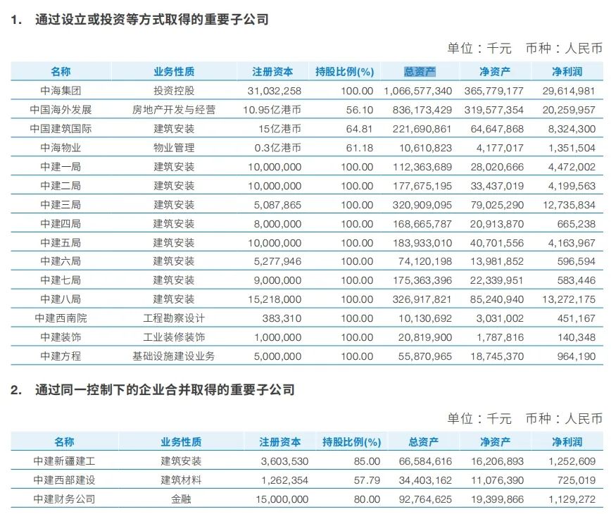 2023年度報(bào)告中,中國(guó)建筑公布重要子公司的總資產(chǎn)、凈資產(chǎn)和凈利潤(rùn)等數(shù)據(jù),具體如下: