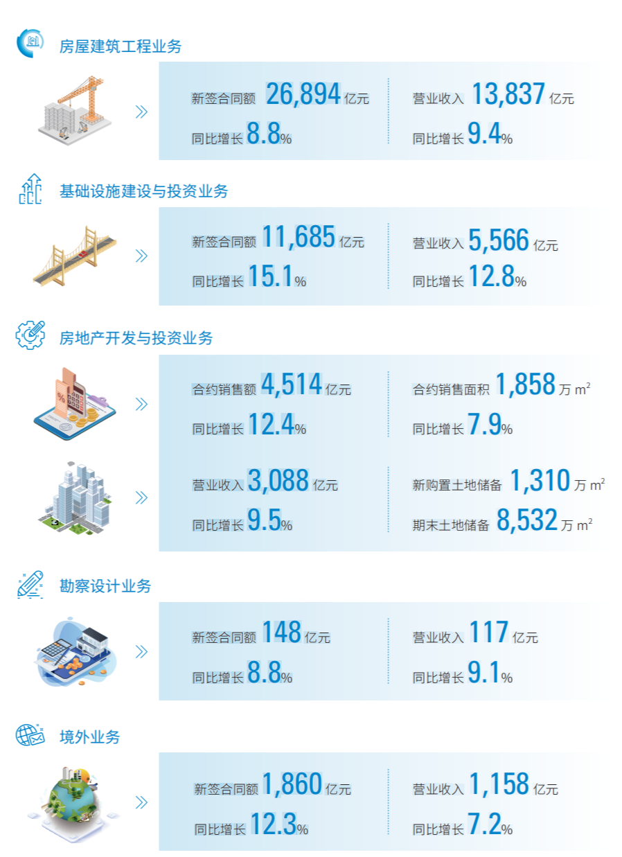 房建業(yè)務(wù)結(jié)構(gòu)持續(xù)優(yōu)化,新簽合同額26894億元,同比增長(zhǎng)8.8%,營(yíng)業(yè)收入13837億元,同比增長(zhǎng)9.4%;