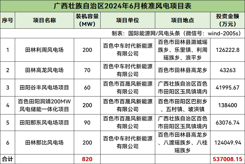 廣西核準(zhǔn)6個風(fēng)電項(xiàng)目,總規(guī)模820MW,總投資537008.15萬元,均為陸上風(fēng)電項(xiàng)目。