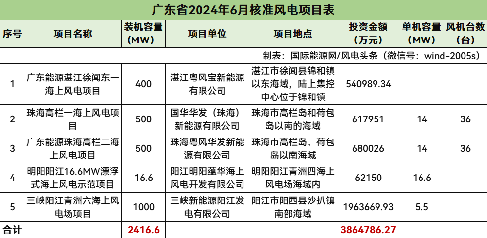 廣東核準(zhǔn)5個風(fēng)電項(xiàng)目,總規(guī)模2416.6MW,總投資3864786.27萬元,均為海上風(fēng)電項(xiàng)目。