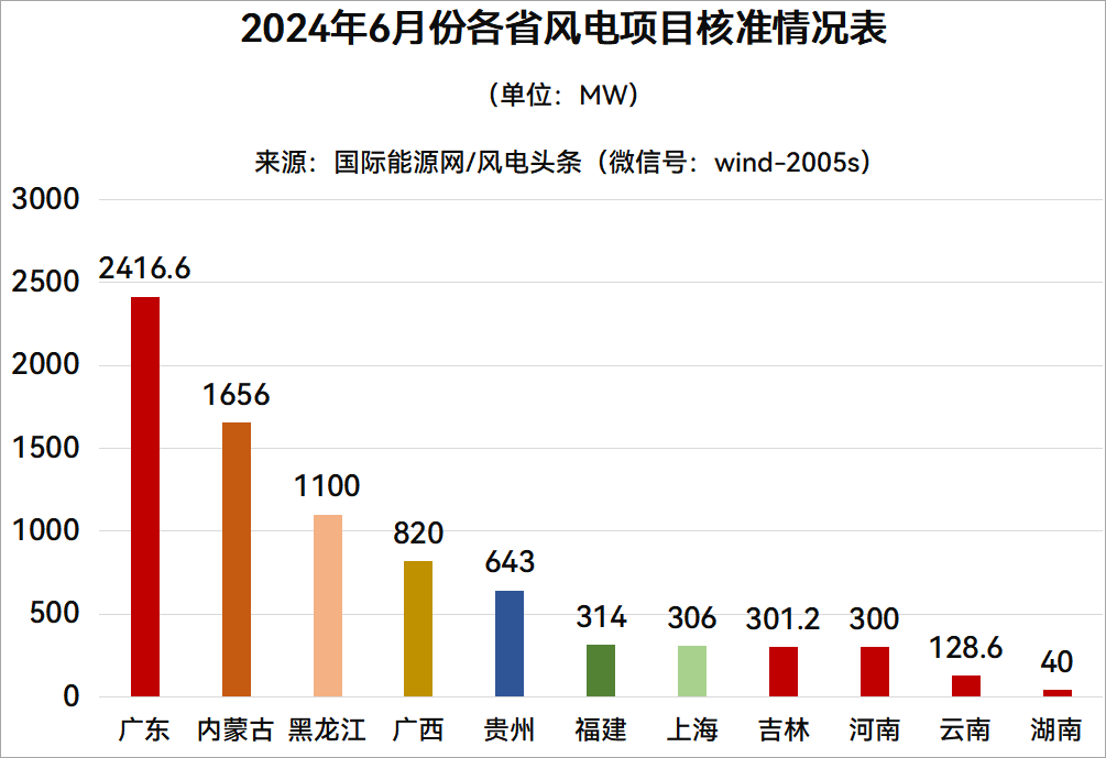 2024年6月風(fēng)電項(xiàng)目獲核準(zhǔn)的省份分別是廣東、內(nèi)蒙古、黑龍江、廣西、貴州、福建、上海、吉林、河南、云南、湖南等11個省份。