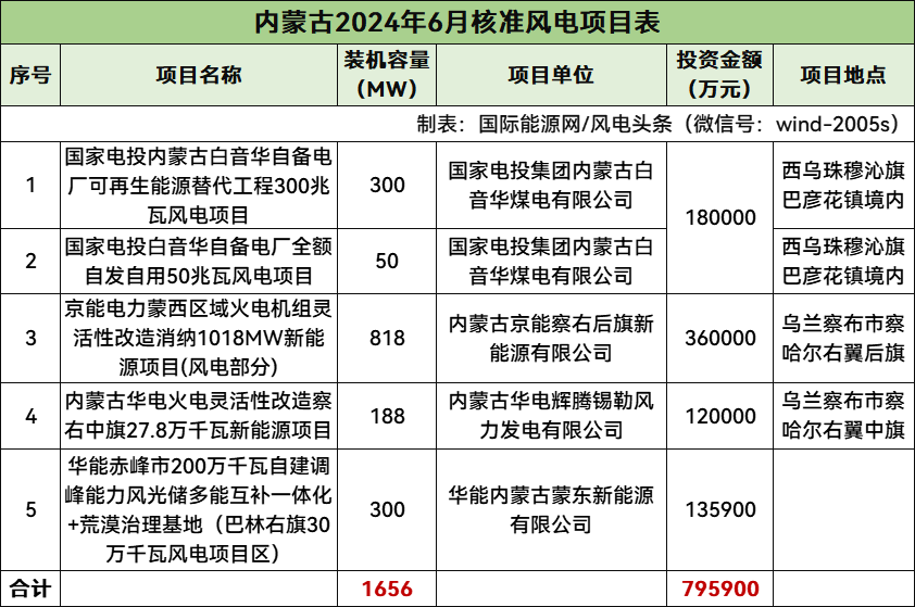 內(nèi)蒙古核準(zhǔn)5個風(fēng)電項(xiàng)目,總規(guī)模1656MW,總投資795900萬元,均為陸上風(fēng)電項(xiàng)目。