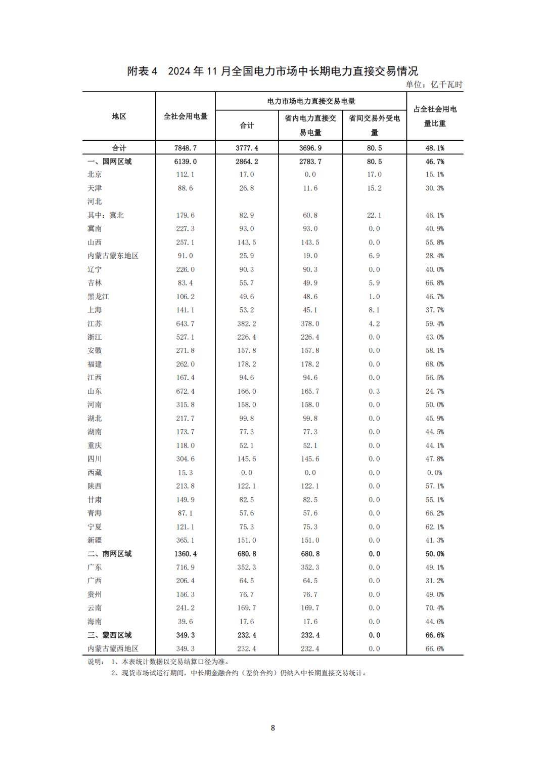 全國各電力交易中心累計(jì)組織完成市場交易電量56029.8億千瓦時,同比增長9.8%,占全社會用電量比重為62.5%,同比增長1.49個百分點(diǎn),占電網(wǎng)售電量比重為75.6%,同比增長1.28個百分點(diǎn)。其中,全國電力市場中長期電力直接交易電量合計(jì)為42191.5億千瓦時,同比增長5.7%。