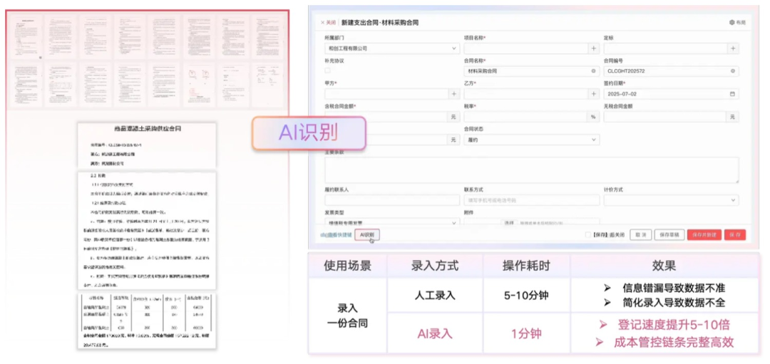借助AI錄單助手,企業(yè)在保證最低管理成本的同時,建立起穩(wěn)健的成本鏈條,實現(xiàn)高效的成本管理與項目推進,不僅能夠提升數(shù)據(jù)質(zhì)量,也能極大提升員工的工作效率與幸福度。