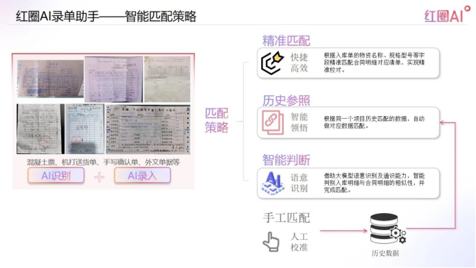 錄單助手還具備智能匹配與成本歸集能力,能智能分析入庫(kù)材料匹配的合同明細(xì)并掛接,厘清成本發(fā)生源頭,方便后期實(shí)際成本精準(zhǔn)統(tǒng)計(jì)及溯源。其匹配策略包括三重機(jī)制:精準(zhǔn)匹配(根據(jù)物資名稱、規(guī)格型號(hào)校對(duì)合同明細(xì))、歷史參照(依據(jù)同一項(xiàng)目歷史數(shù)據(jù)自動(dòng)匹配)、智能判斷(借助大模型語(yǔ)意識(shí)別相似性),確保錄入既快又準(zhǔn)。