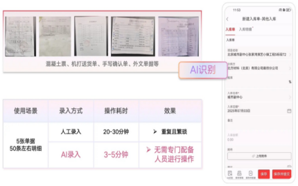 在工地,比扛鋼筋更累的是錄單據(jù)——合同、結(jié)算單、出入庫單,年輕技術(shù)員每天花幾小時(shí)對(duì)著紙質(zhì)單據(jù)敲鍵盤,枯燥易錯(cuò),毫無成就感。紅圈AI深刻理解這些場(chǎng)景:成本專員需手動(dòng)處理合同文本,逐頁閱讀并提取關(guān)鍵信息;施工班組每月提交的紙質(zhì)結(jié)算單需逐條輸入系統(tǒng);單項(xiàng)目材料種類可達(dá)數(shù)千種,材料員需每天及時(shí)逐條輸入出入庫信息。