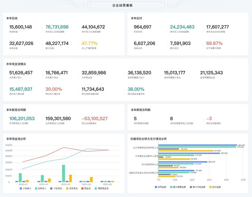 系統(tǒng)呈現(xiàn)公司級現(xiàn)金流看板+單項目收付款計劃/應收/應付/墊資等關(guān)鍵指標的數(shù)據(jù)穿透 |