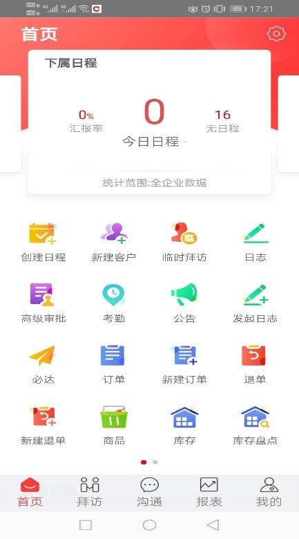 登陸后,下方為主要的操作按鈕:首頁(yè)、拜訪、溝通、報(bào)表、我的。首頁(yè)為主要的功能模塊,可以通過(guò)右上角的設(shè)置(齒輪按鈕)來(lái)進(jìn)行模塊調(diào)整;